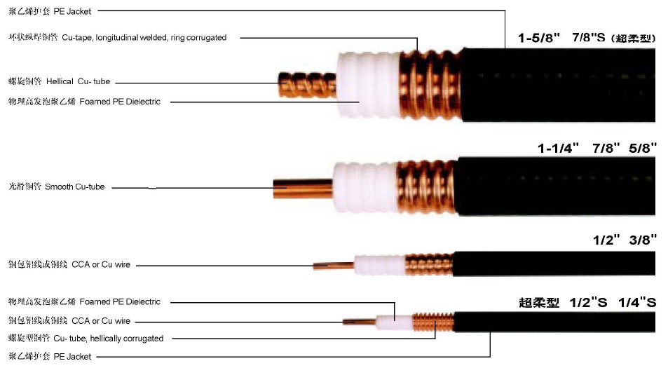 漢勝50歐姆皺紋銅管同軸電纜共有6個(gè)規(guī)格, 并根據(jù)使用需要研制了1/2 "S的超柔型電纜。